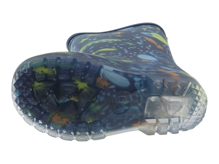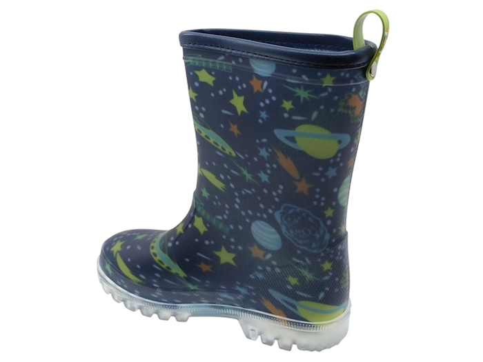 Estas botas con estampado espacial son para los que no se quedan mirando por la ventana. Fabricadas en goma para que los charcos no tengan ninguna oportunidad y con luces LED en la suela para que cada pisada sea un evento galáctico.